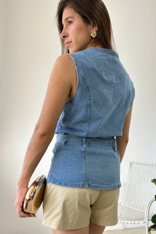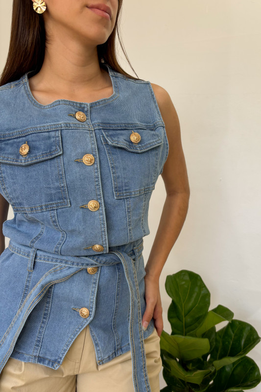 Blusa tipo chaleco en mezclilla tono medio, con botones dorados, bolsillos al frente y cintillo ajustable en misma tela.