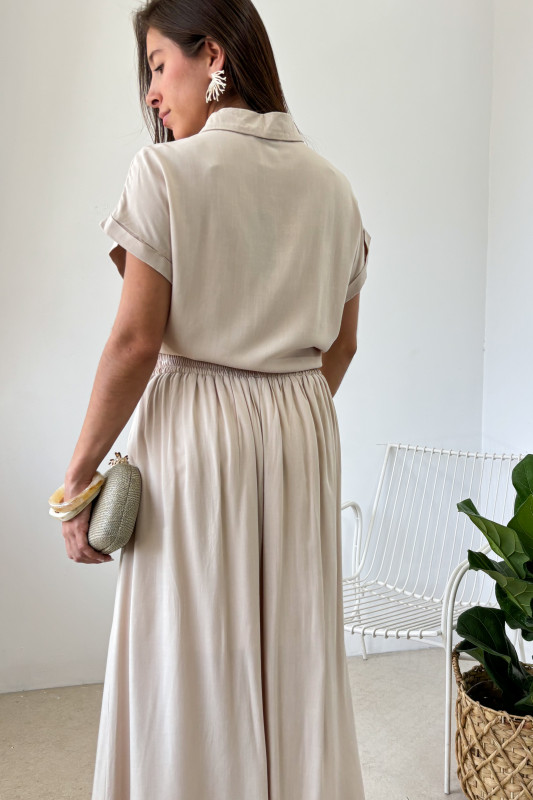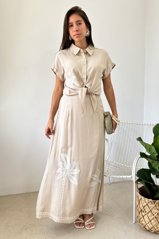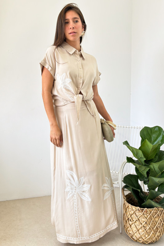 Set en tejido ligero con bordados de palmas en contraste, blusa corta tipo polo con lazos ajustables al frente; falda larga en corte relajado con elástico en espalda y forro largo.