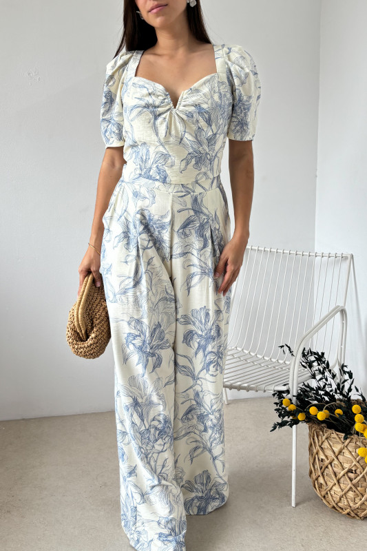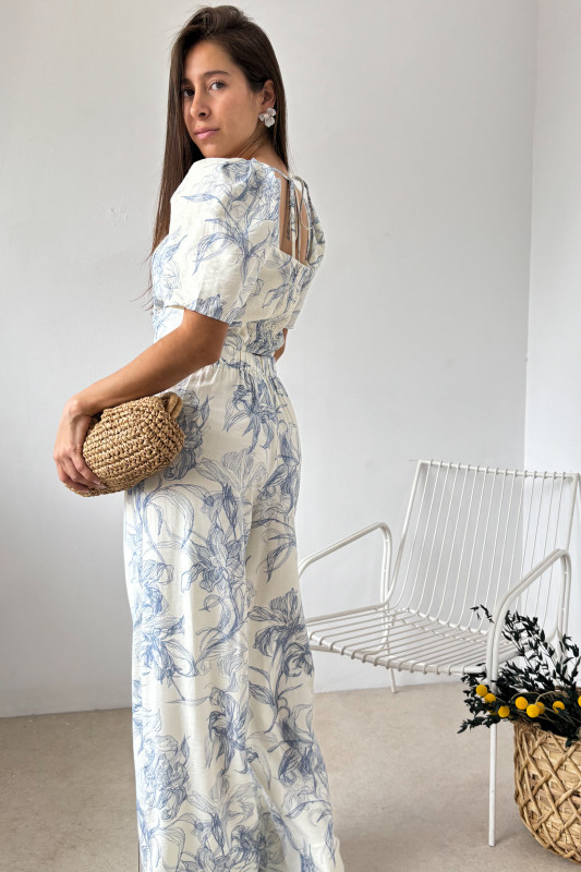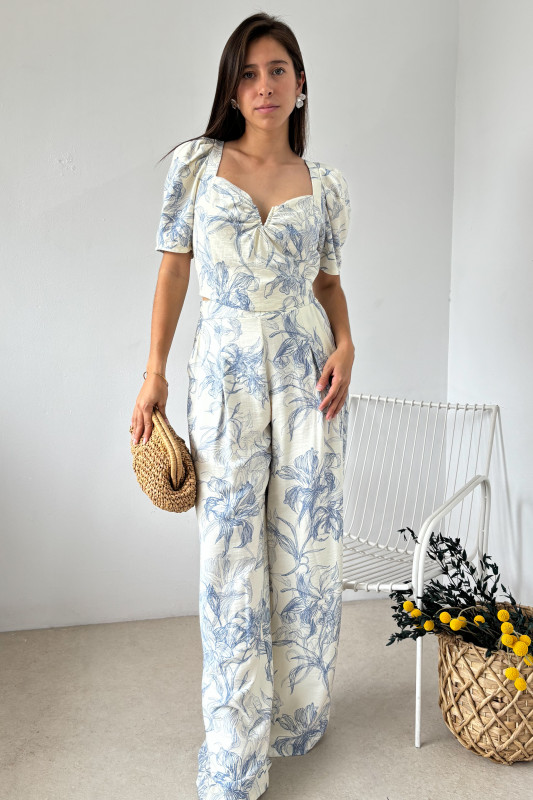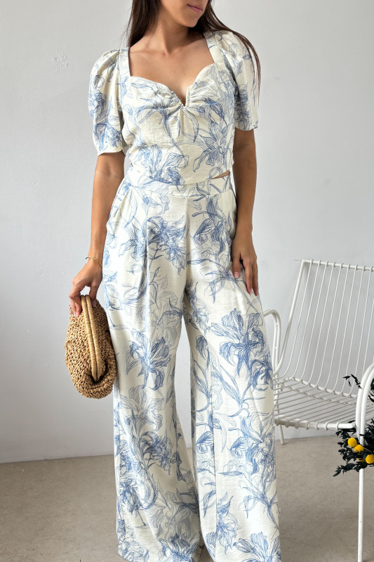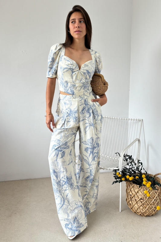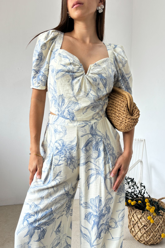 Set en dos piezas en tela ligera con estampados florales, pantalón corte relajado con piernas anchas y elástico en espalda; blusa corta con escote corazón, mangas tipo globo con lazos ajustables en espalda.