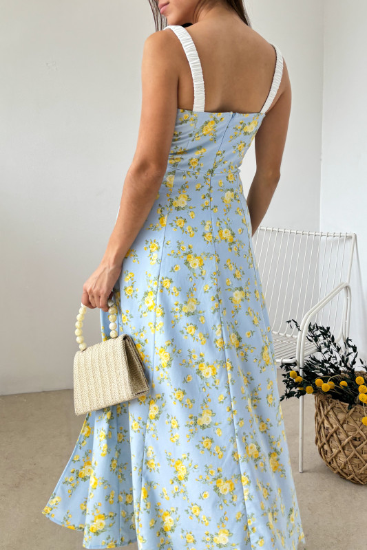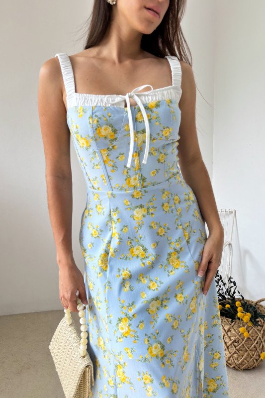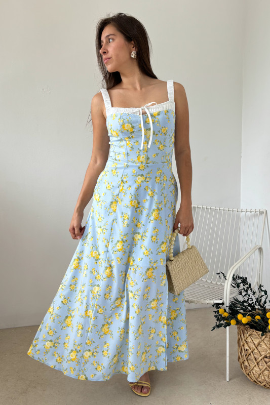 Vestido largo midi en estampado floral, parte alta en corte semiajustado tipo corset con tirantes anchos drappeados y efecto tipo lencería, falda circular con apertura alta.