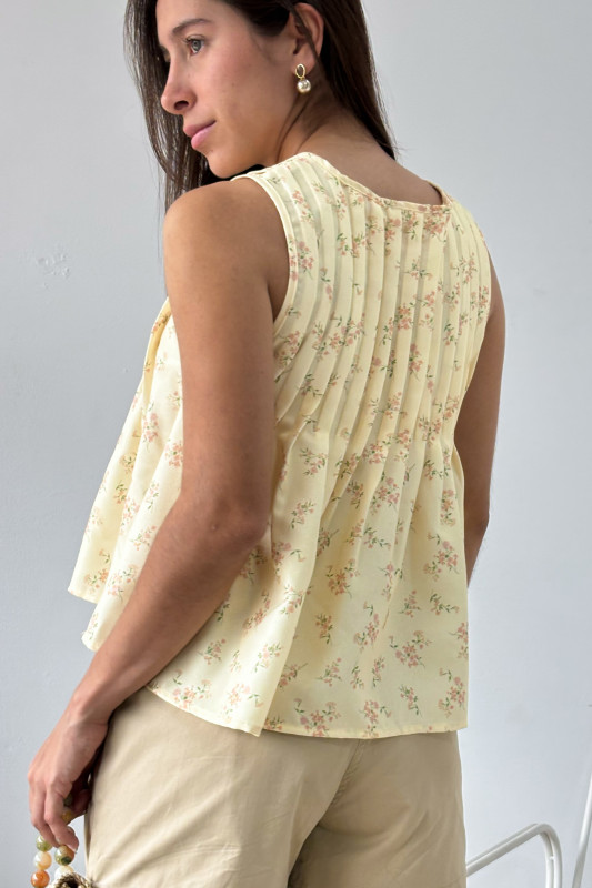 Blusa corte relajado en estampado floral, parte alta con alforzas verticales y lazos ajustables al frente.
