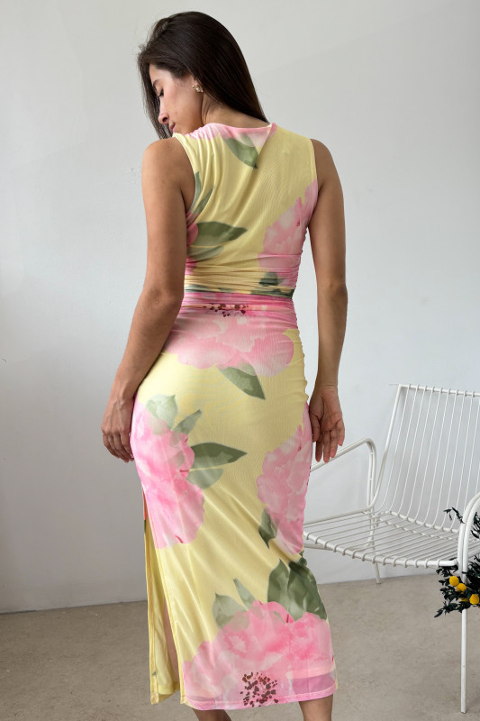 Vestido en mesh con doble tela, estampado floral en contraste; efecto drappeado en cintura y apertura lateral en pierna.