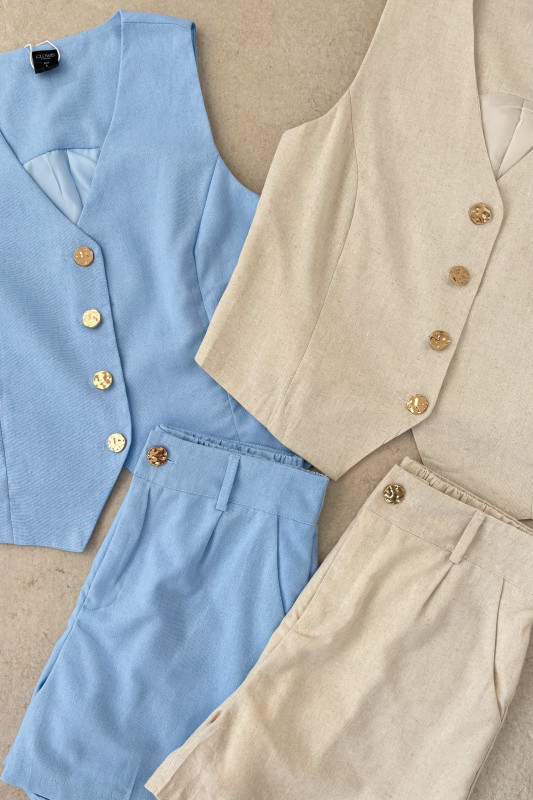 Set en dos piezas en tejido ligero con forro; chaleco corte semiajustado con botones dorados al frente, short corto con elástico en espalda y bolsas laterales.