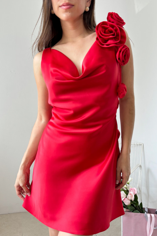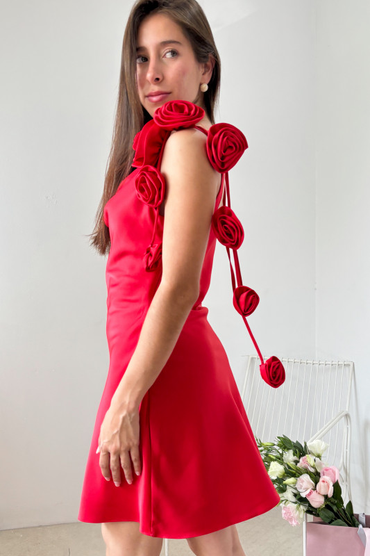 Mini vestido en tela satinada, con escote tipo hamaca, lazos ajustables en espalda y detalles de listones con flores voluminosas en misma tela.