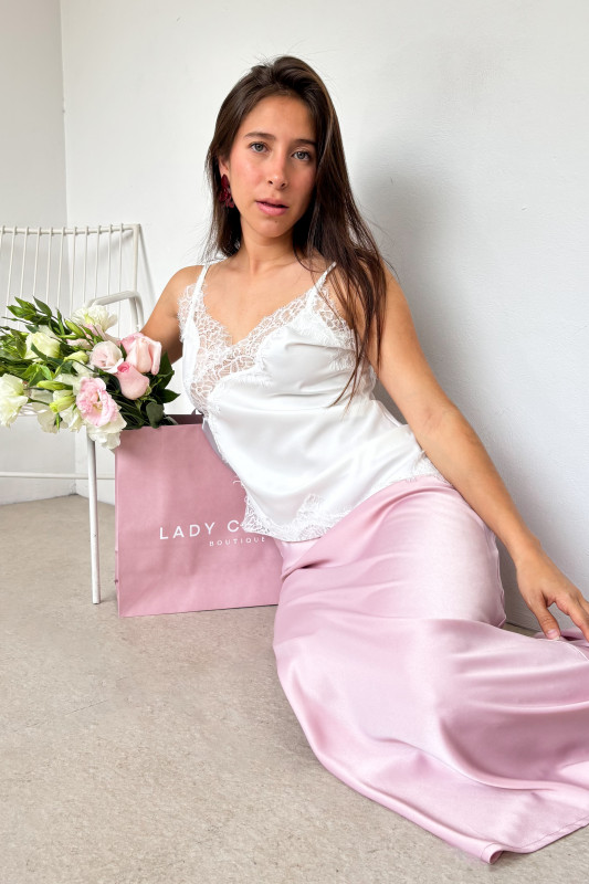 Blusa corte lencera asimetrica en tela satinada con escote y aplicaciones de encaje; cierre en espalda y tirantes ajustables.