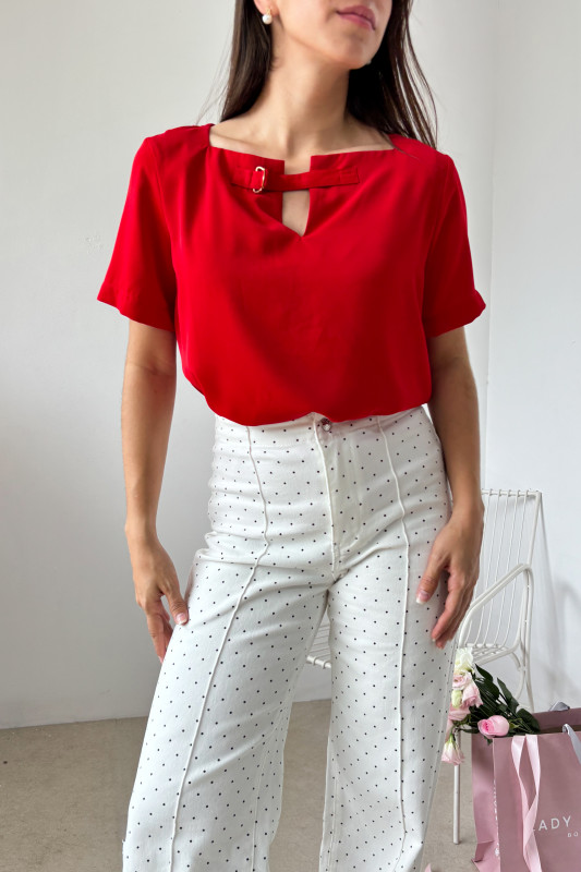 Pantalón en mezcilla strech con estampado de lunares en contraste, tiro alto, corte recto y detalle de costuras al frente.