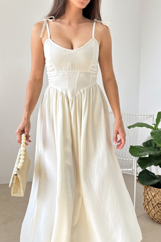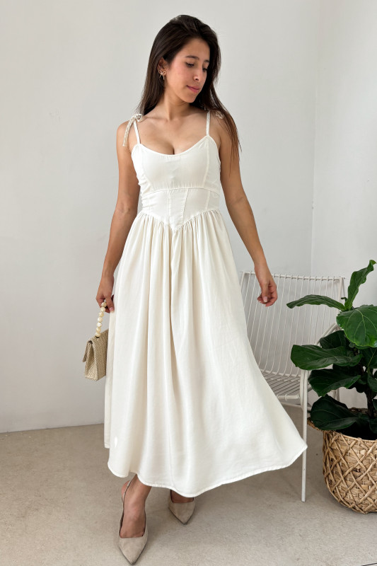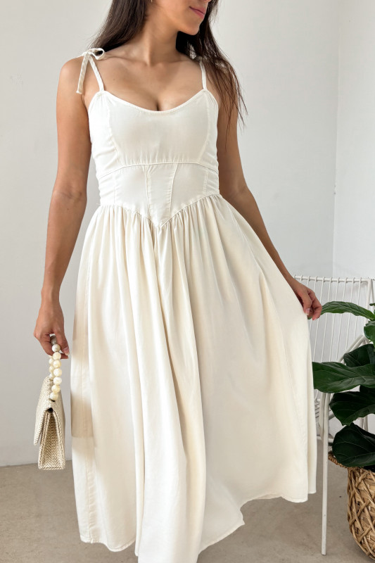 Vestido largo midi en tejido ligero, parte alta en corte tipo corset con elástico drappeado en espalda y lazos ajustables, falda larga en corte relajado.