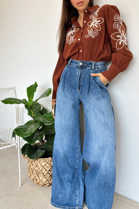Blusa en corte relajado en tejido ligero con bordados florales en contraste y mangas amplias con puños anchos.
