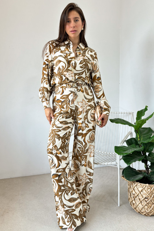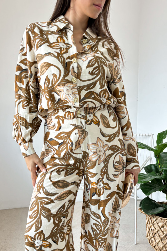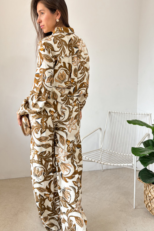 Set en dos piezas en tela ligera con estampados florales; camisera corte relajado con botones dorados en forma de flor; pantalón tiro alto con corte relajado y elástico drappeado en cintura.