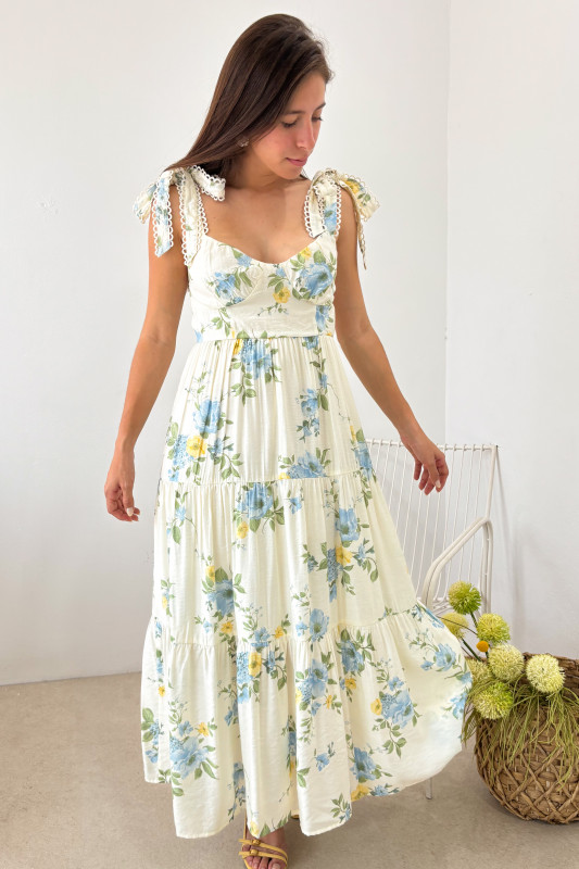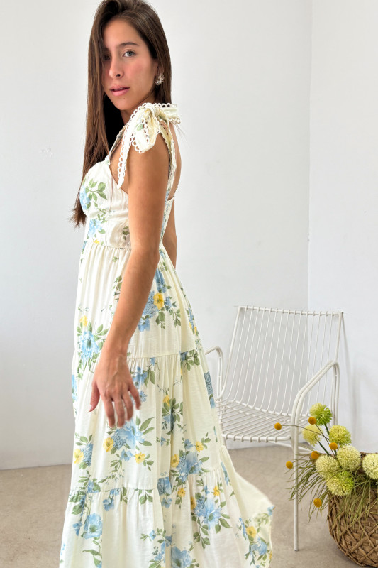 Vestido largo midi en estampado floral; parte alta ajustada con elástico en espalda, lazos no ajustables y falda en corte relajado.