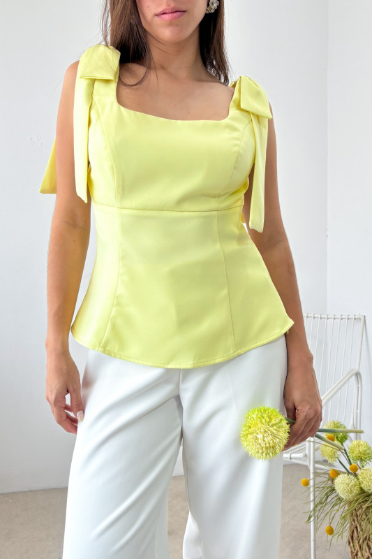 Blusa semiajustada en corte tipo peplump, lazos resaltados en hombros y cierre lateral.