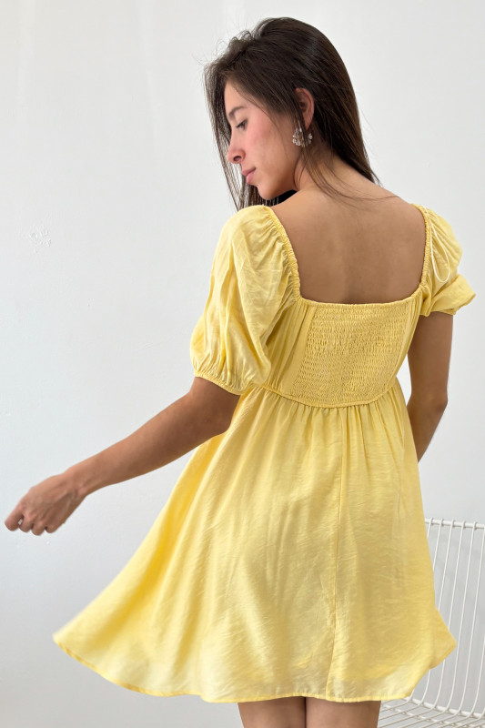 Vestido corto en tela liegra, parte alta con alforzas al frente, mangas tipo globo y elástico drappeado en espalda; falda circular corte relajado.