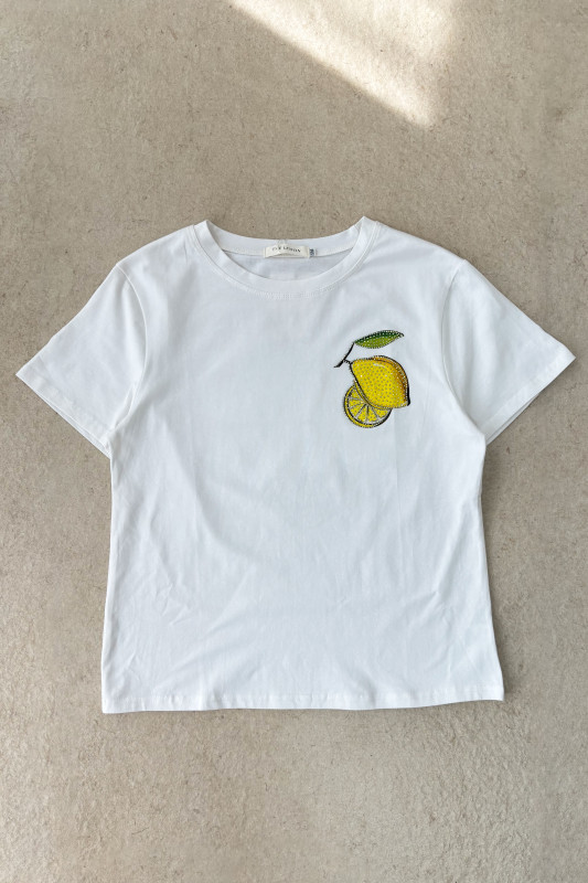 Playera corte regular en algodón ligero con aplicaciones de estampados florales y brillantes en el frente y en espalda.