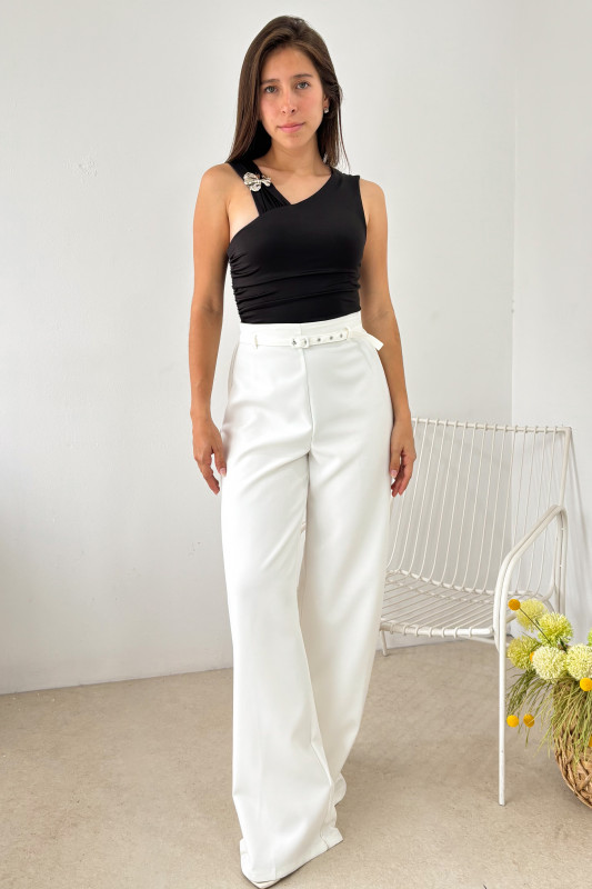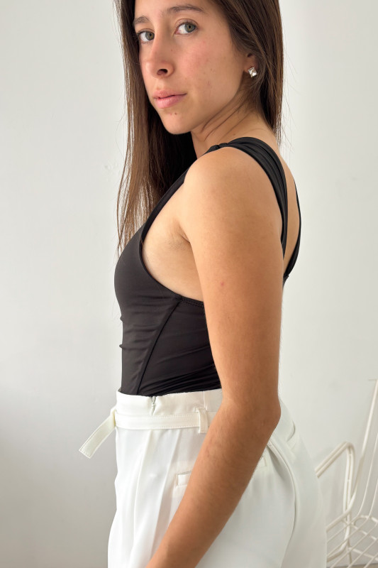 Body corte semiajustado con elástico drappeado en cintura y escote asimetrico con aplicación de hebilla metálica de flor.