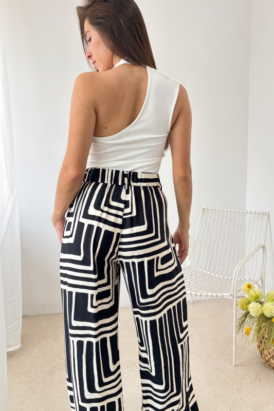 Pantalón en corte relajado con estampado de grecas en contraste, elástico drappeado en espalda y bolsas laterales.