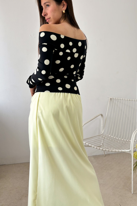 Blusa corte semiajustada en estampado de lunares en contraste, escote bardot y aplicación y hebilla metálica al frente.