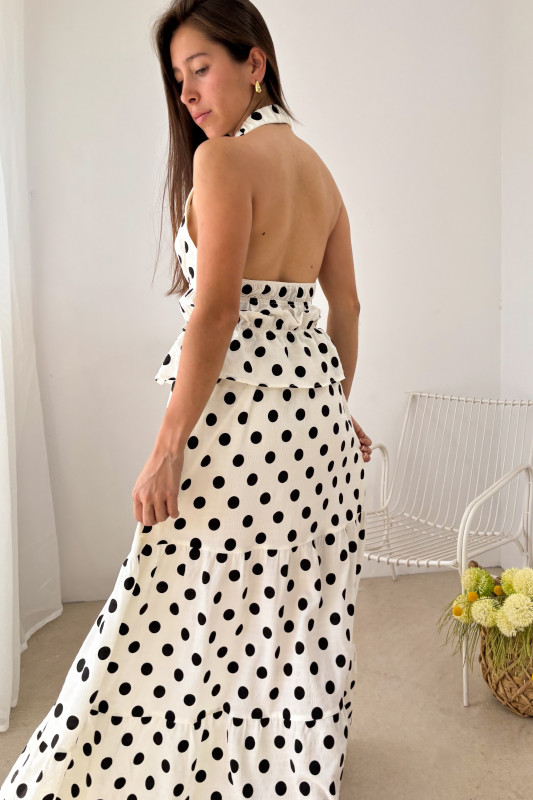 Set en dos piezas, blusa halter con escote pronunciado con lazos ajustables y ligero corte peplump; maxi falda en tela ligera con elástico en cintura y apertura alta en pierna.