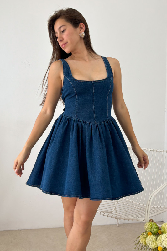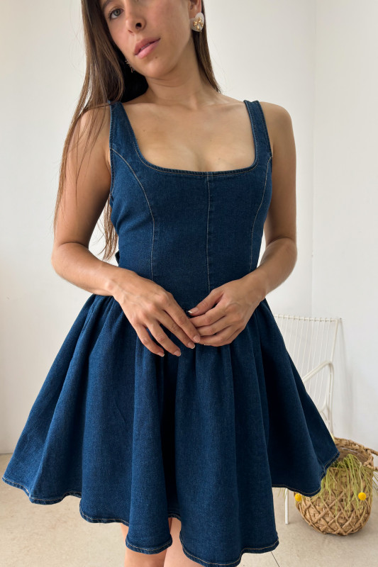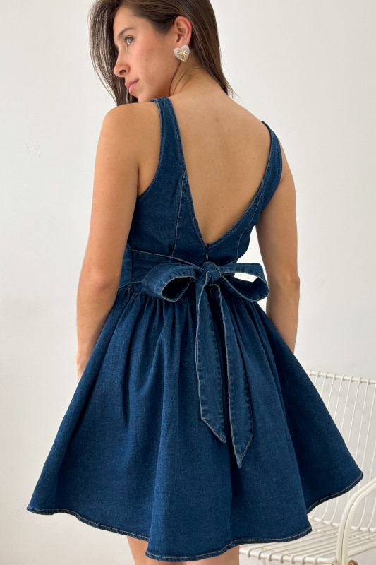 Vestido corto en mezclilla oscura con pespuntes en contraste, escote V pronunciado en espalda y lazos ajustables en misma tela.