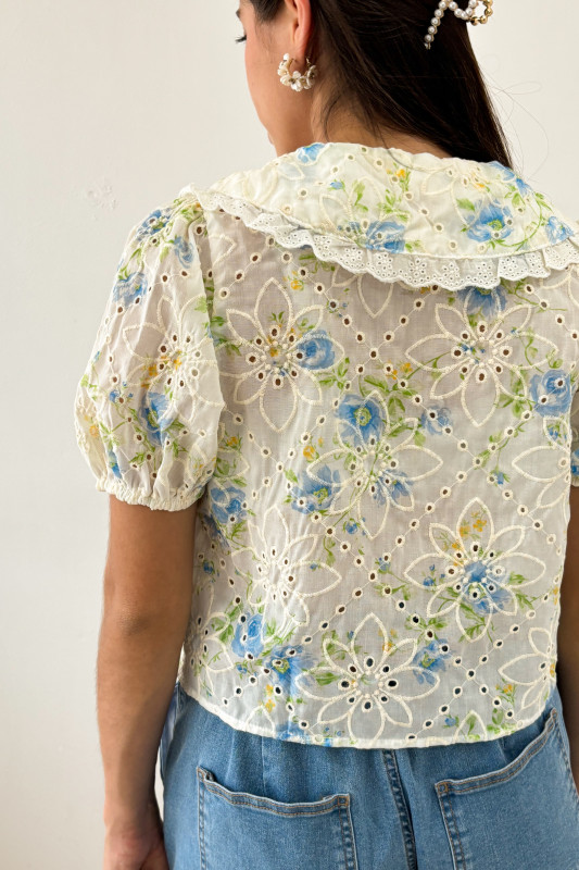 Blusa en corte relajado en algodón bordado y estampado floral en contraste, cuello tipo marinero y lazos ajustables al frente.