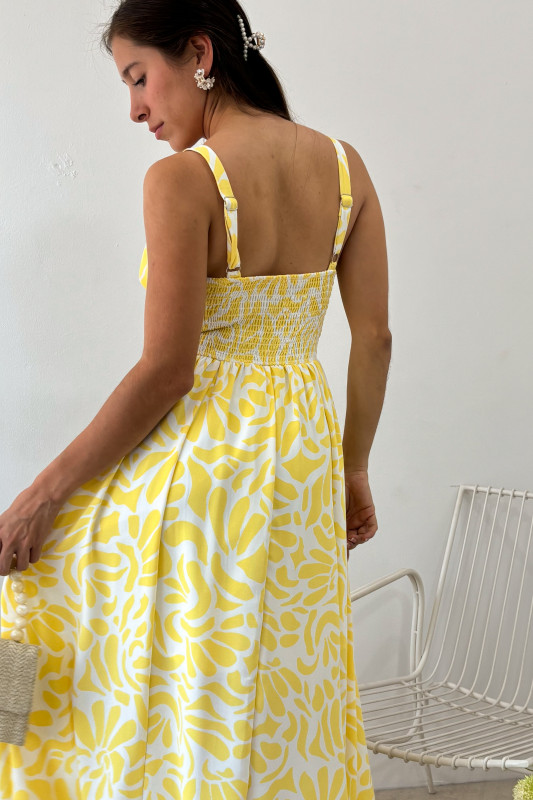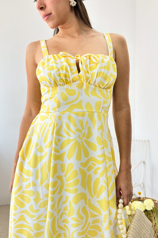 Midi vestido en tela ligera con estampago en contraste, parte alta en corte semiajustada busto con efecto drappeado, lazos y tirantes ajustables; elástico en espalda y peto definidio, falda ligera con apertura alta en pierna.