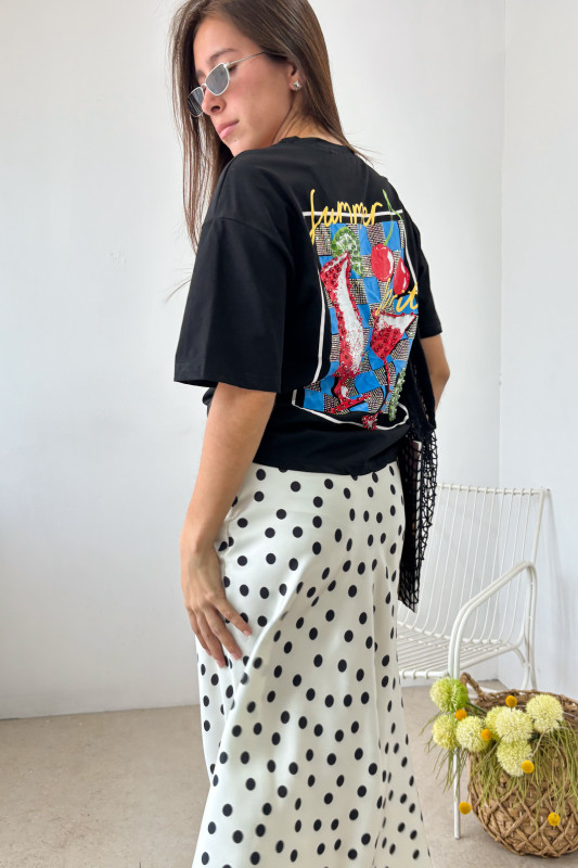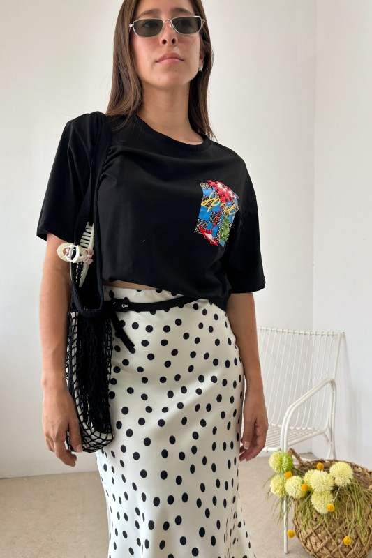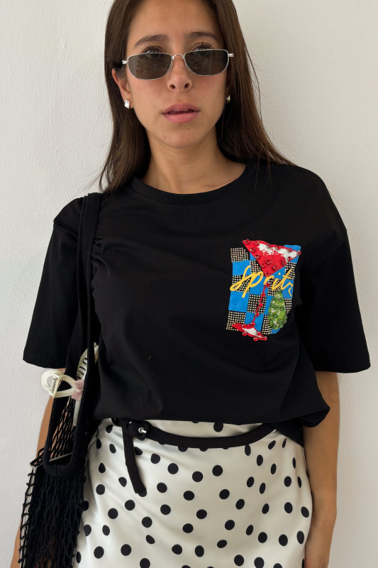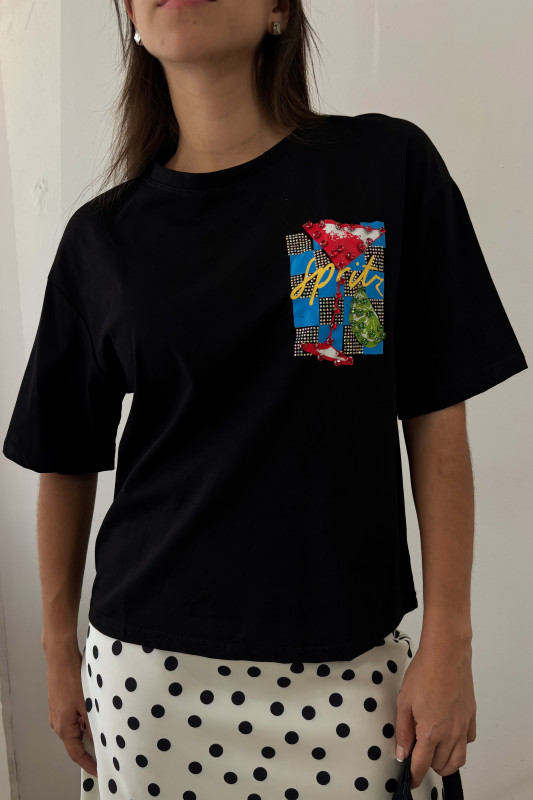 Playera en corte regular con aplicaciones de estampados y aplicaciones de brillantes y pedrería.