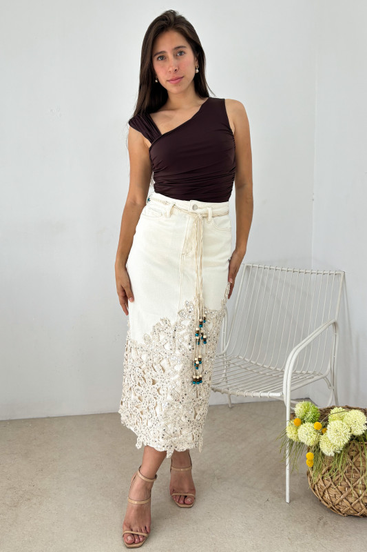 Blusa corta semiajustada en doble tela con efecto drappeado y escote asimetrico.