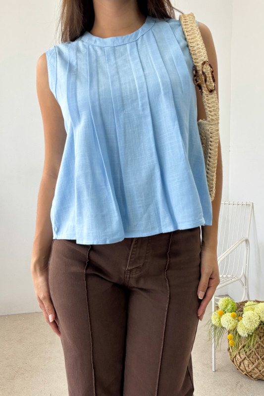 Blusa corte ligero con alforzas verticales, cuello redondo y botón en espalda.