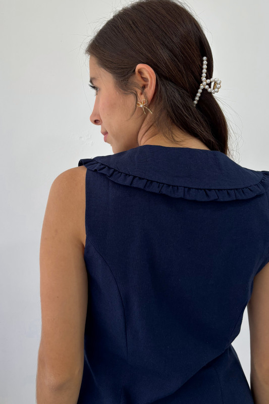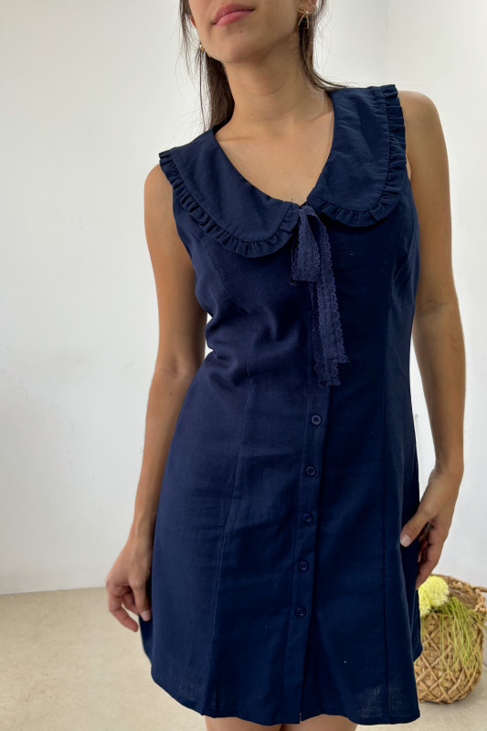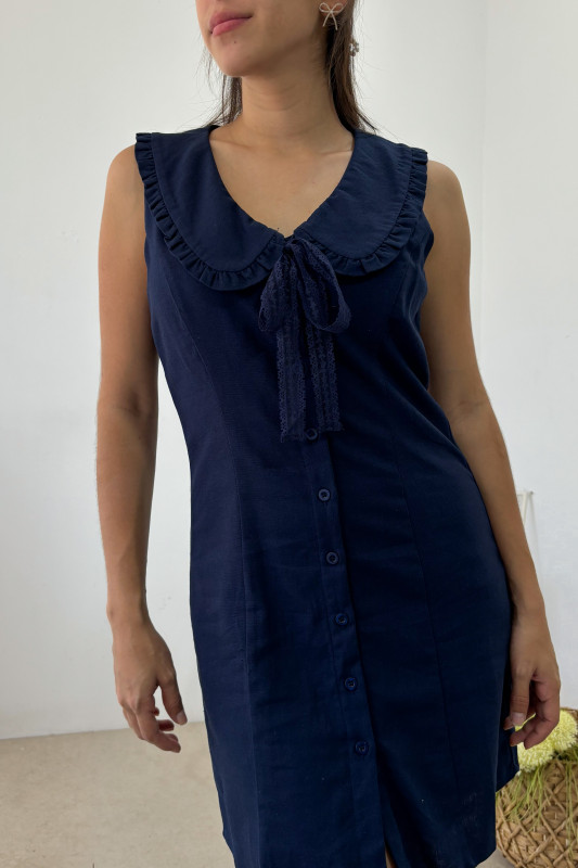 Vestido corto, corte semiajustado con cuello tipo peter pan y lazos de encaje al frente.