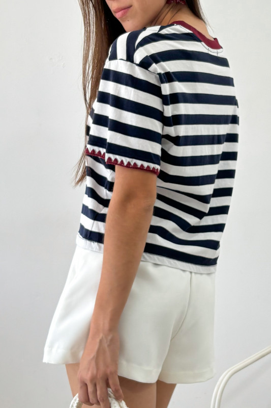Playera corta en algodón ligero estampado de líneas y texto en contraste; bastillas con puntadas en contraste.