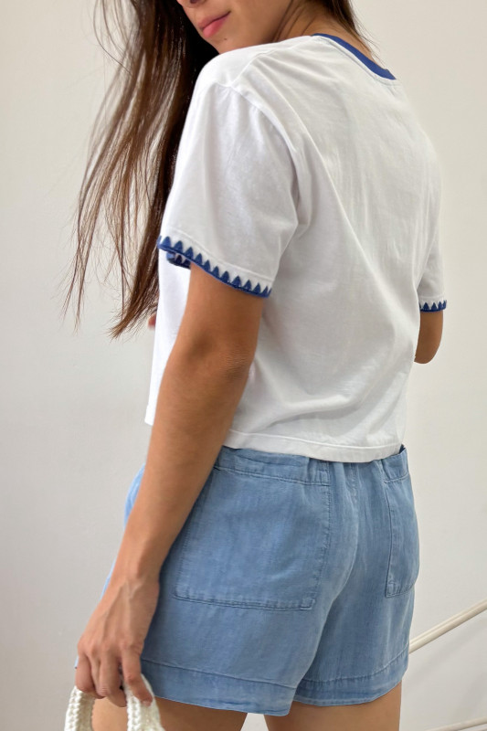 Playera corta con estampado en contraste, cuello y puntadas en azu.