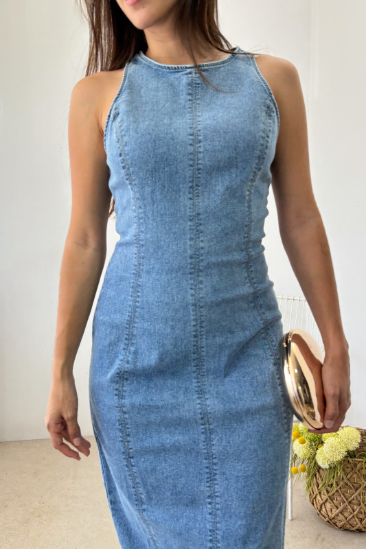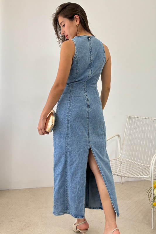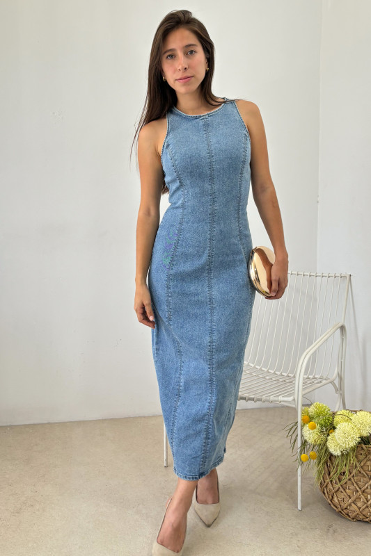 Vestido largo midi en mezclilla estrech tono medio, corte semi ajustado con cierre en espalda y apertura baja.