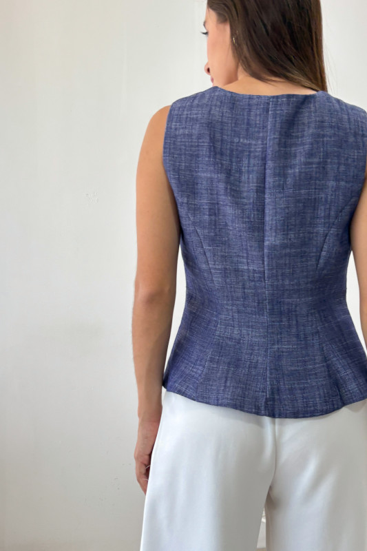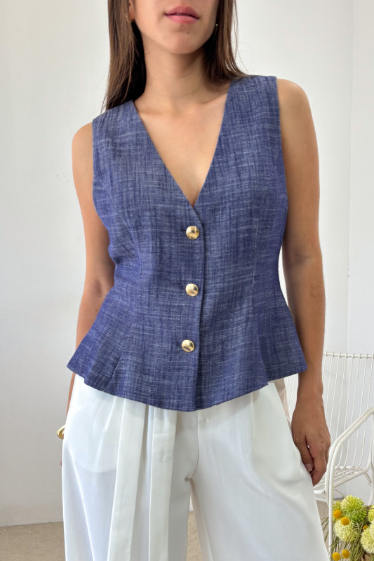 Chaleco en tejido ligero, corte regular con forro interno y botones dorados en contraste.