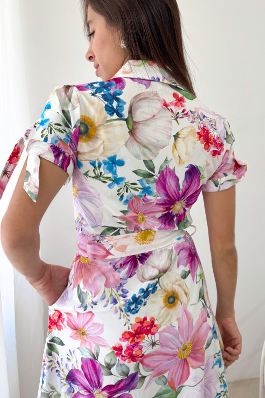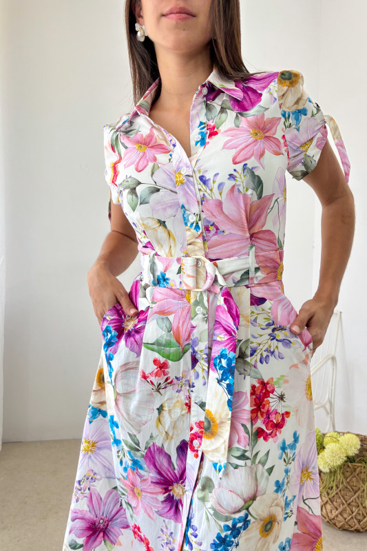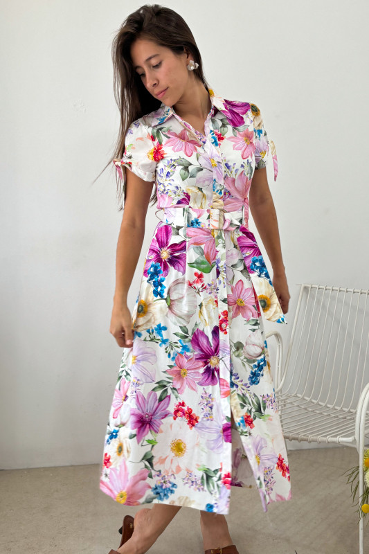 Vestido midi en tela strech con estampado floral; parte alta en corte semiajustado con mangas cortas y lazos ajustables; cintillo ajustable en misma tela y falda corte relajado.