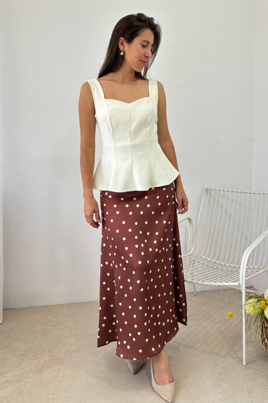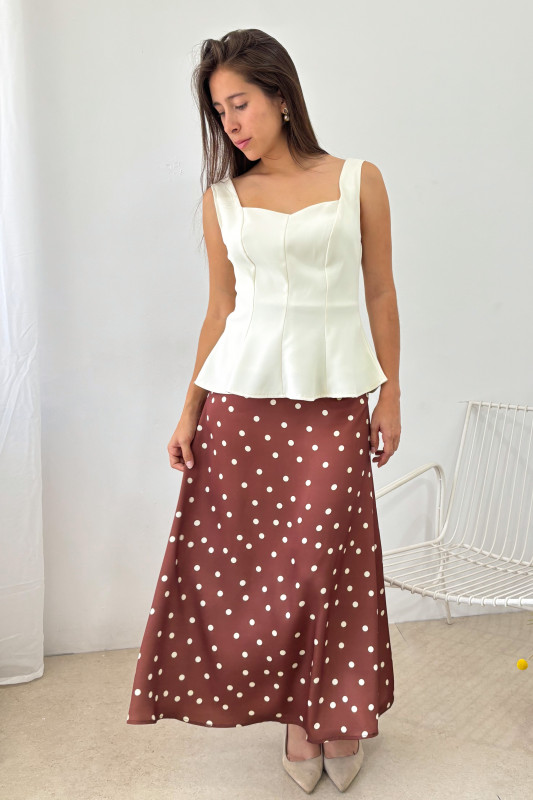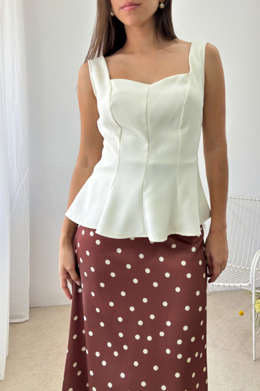 Blusa peplump, corte semiajustado con escote recto y ligero olan en cintura y cierre lateral.