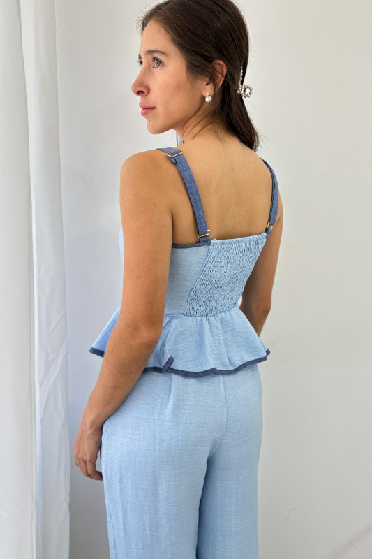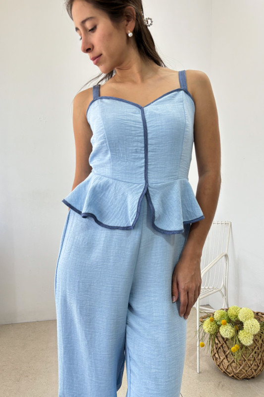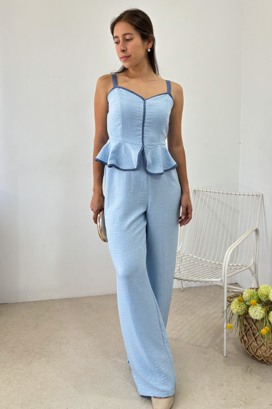 Palazzo en simulación dos piezas; parte alta en corte peplump con elástico en espalda, cierre lateral y tirantes ajustables; pantalones en corte recto con bolsas laterales.
