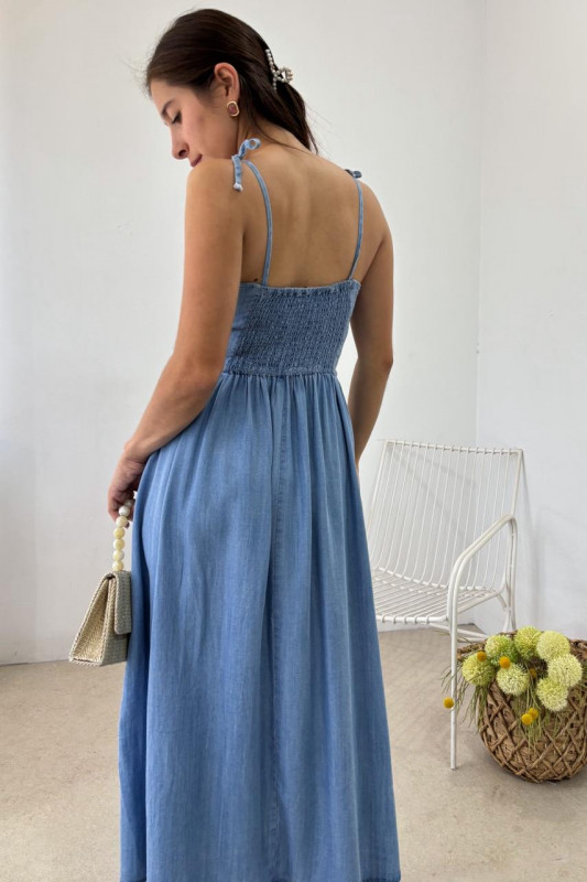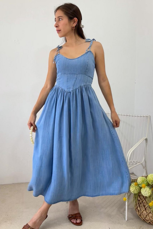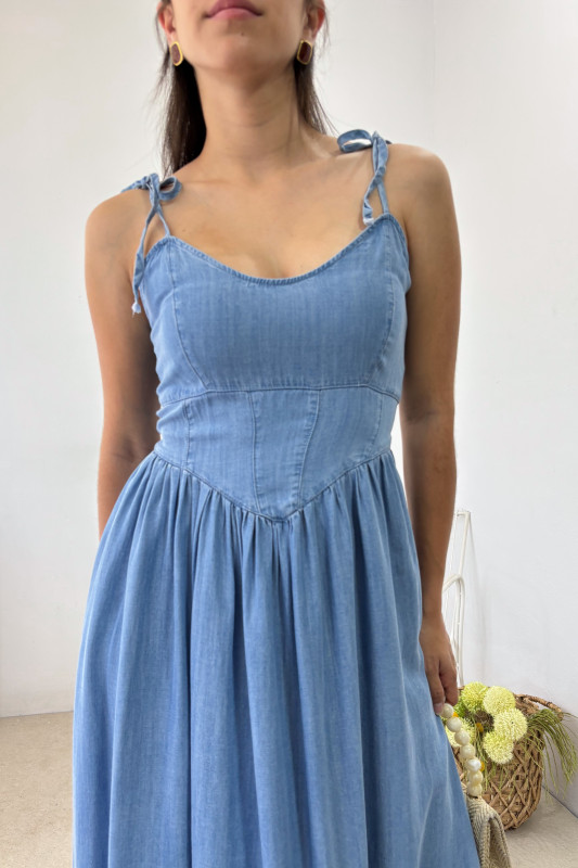 Vestido largo midi en tejido ligero, parte alta en corte tipo corset con elástico drappeado en espalda y lazos ajustables, falda larga en corte relajado.