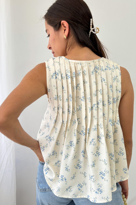 Blusa corte relajado en estampado floral, parte alta con alforzas verticales y lazos ajustables al frente.