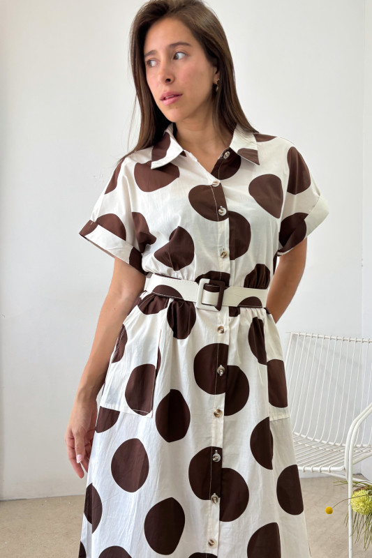 Maxi vestido en tela ligera con estampado de lunares en contraste; parte alta tipo polo con mangas fluidas, falda corte relajado y cintillo ajustable en misma tela.