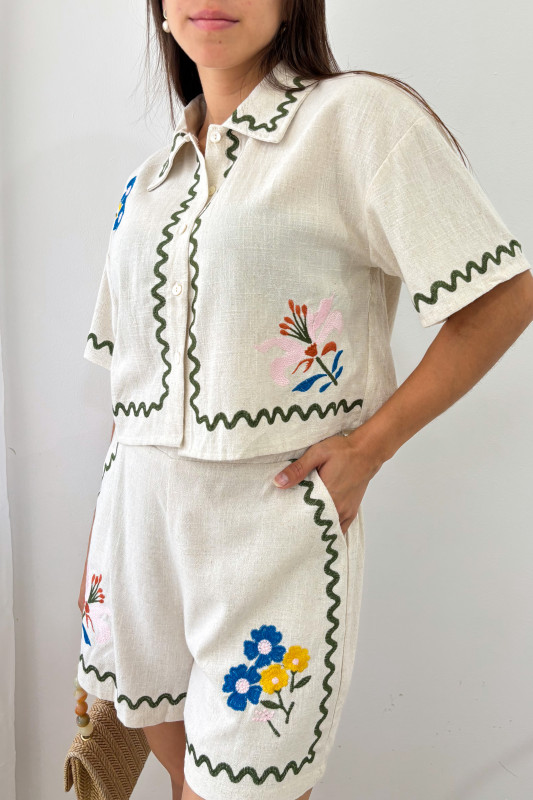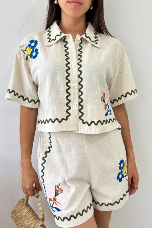 Set en dos piezas, en tela ligera con bordados de grecas y flores en contraste; parte alta en blusa corte relajado y short corte relajado con elástico en cintura y bolsas laterales.