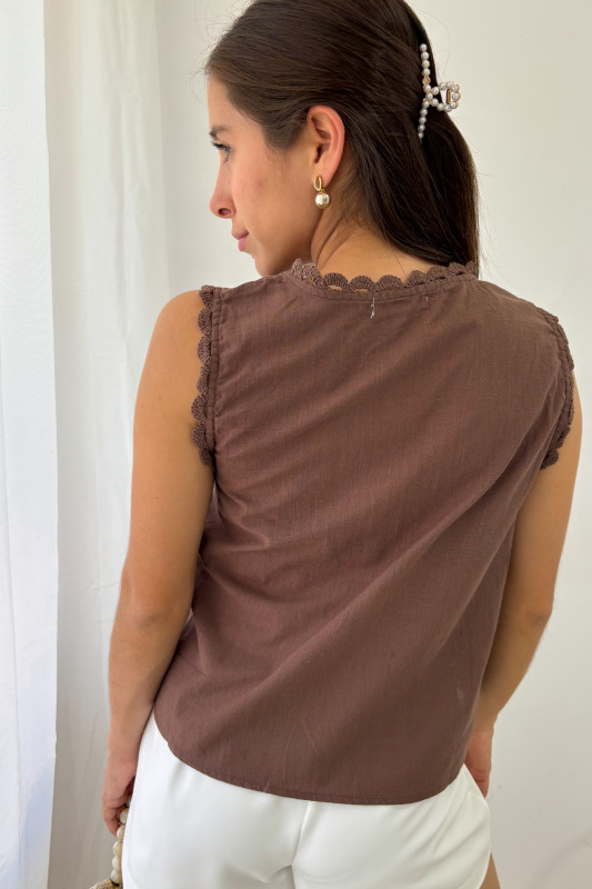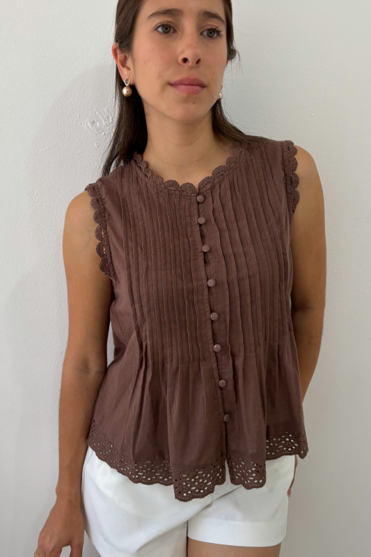 Blusa corte relajado en tejido ligero, con alforzas y aplicaciones de bordados en contornos.