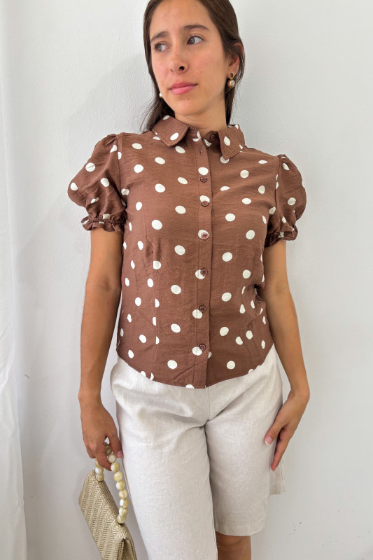 Blusa corte regular en estampado de lunares en contraste, botones al frente y mangas cortas con abullonado..