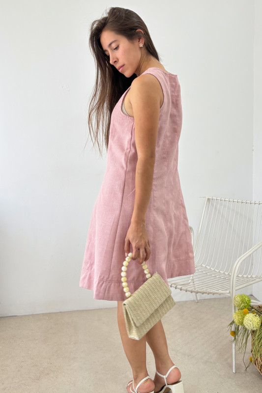 Vestido corto, en línea A; corte remi amustado en parte alta y falda en corte relajado; pinzas verticales y bastilla ancha en falda.