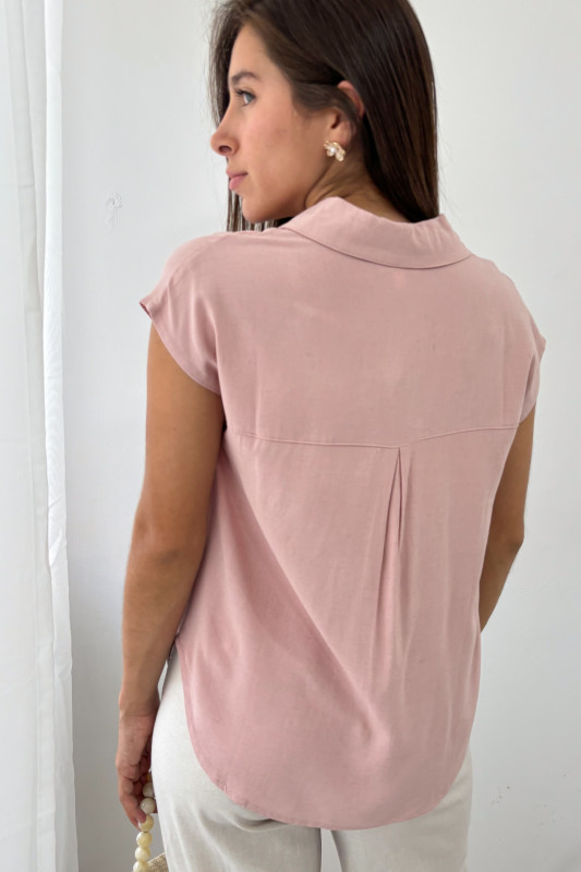 Blusa corte relajado en tela ligera, cuello tipo polo y botones en contraste al frente