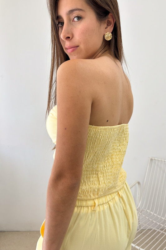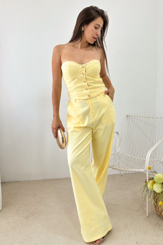 Set en dos piezas strech, parte alta tipo corset con botones al frente, copas y elástico drappeado en espalda; pantalón recto con tiro alto, bolsas laterales y elástico en espalda.