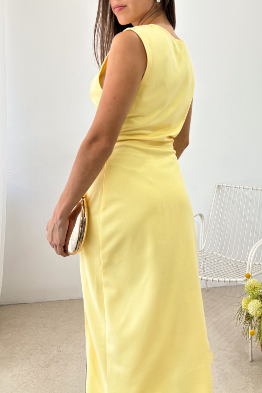 Vestido largo midi en corte semiajustado en tela con ligera textura acanalaada, cierre lateral y hebillas ajustables; apertura alta en pierna.