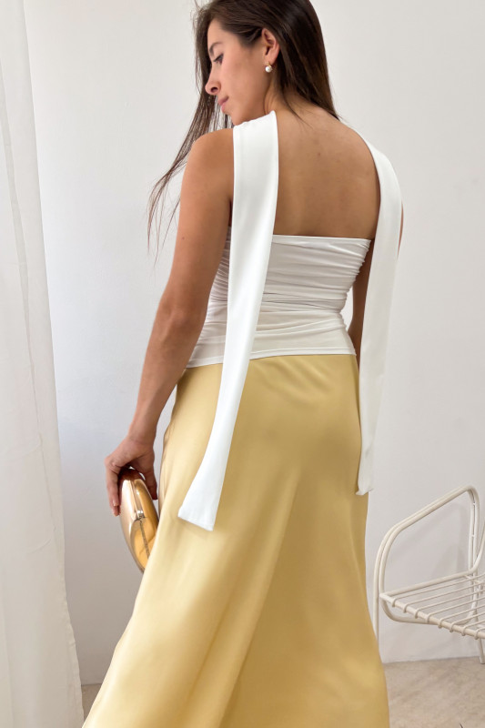 Top strapple en doble tela strech con elásticos drappeados en laterales; lazo opcional en misma tela.