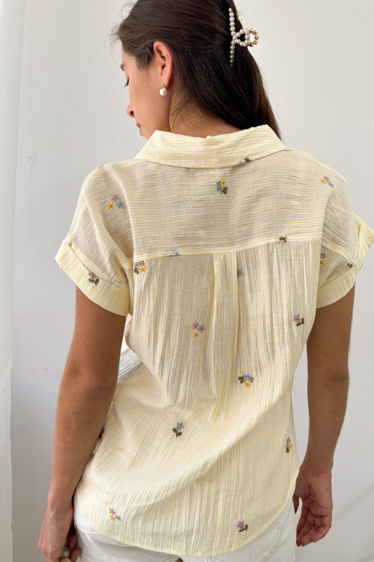 Busa tipo camisera con manga corta en tela ligera con textura y aplicaciones de bordados florales, bolsa al frente y botones en contraste.