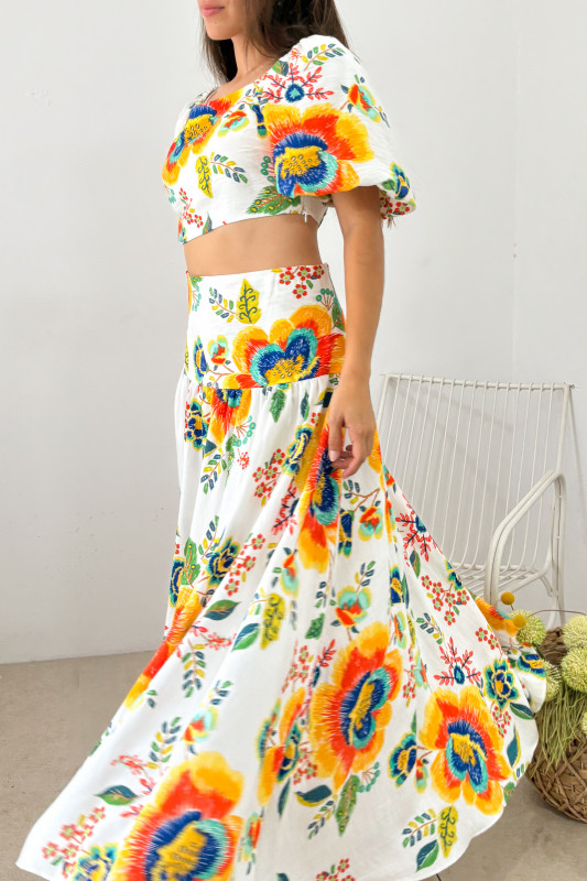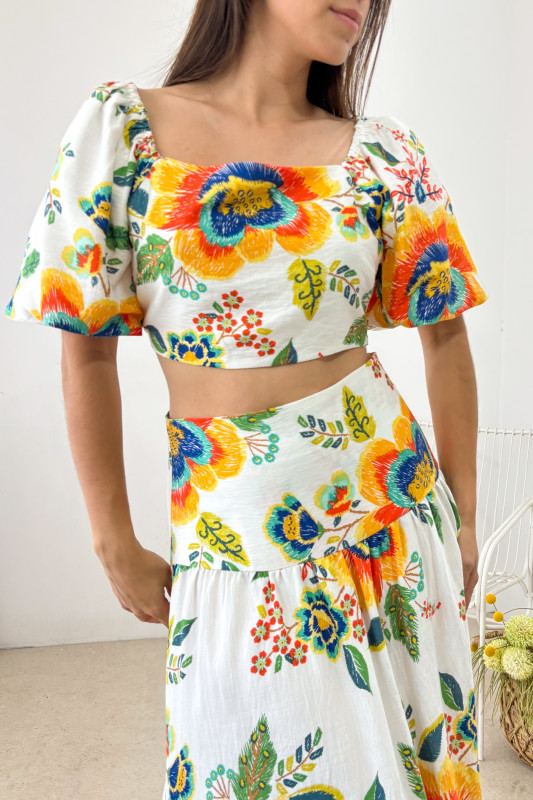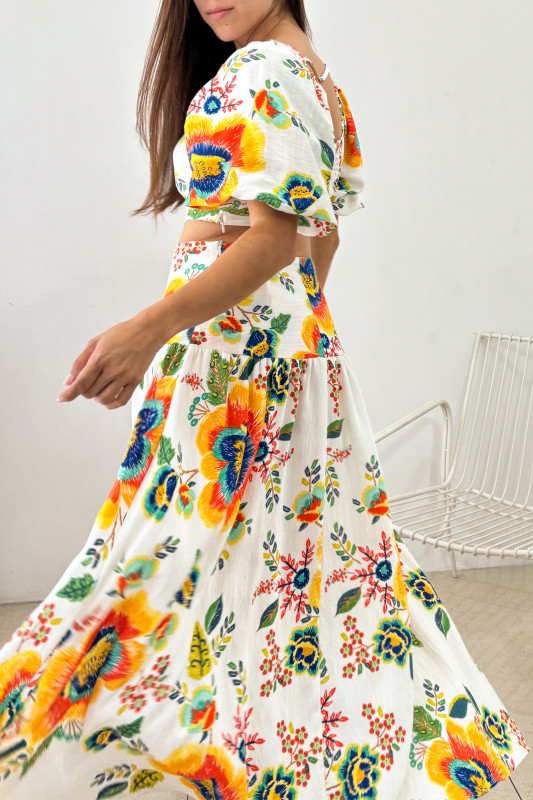 Set en dos piezas en tela ligera con estampados florales, parte alta a modo de top ajustado con elástico drappeado en espalda y mangas amplias tipo globlo; maxi falda en tela ligera con cadeja ajustada.