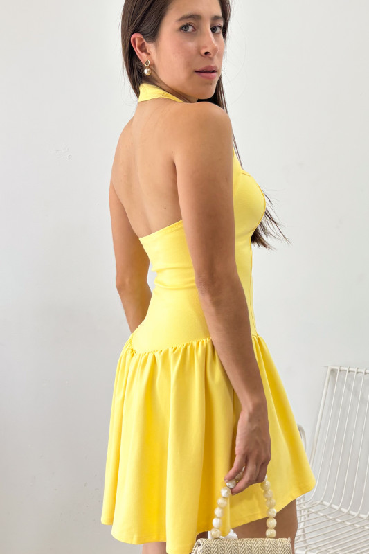 Vestido corto en tela ligera, parte alta en corte semiajustado con cuello haltter y falda amplia.