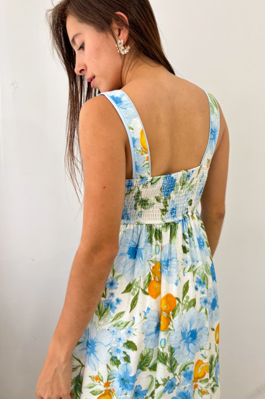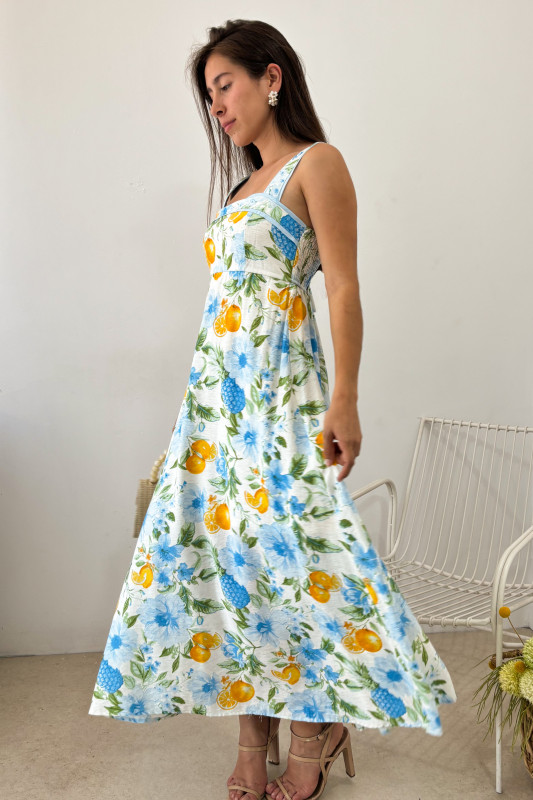 Vestido largo midi en tela ligera con estampados florales y frutales, parte alta en corte regular con elástico drappeado en espalda; tirantes anchos y falda ligera sin aperturas.